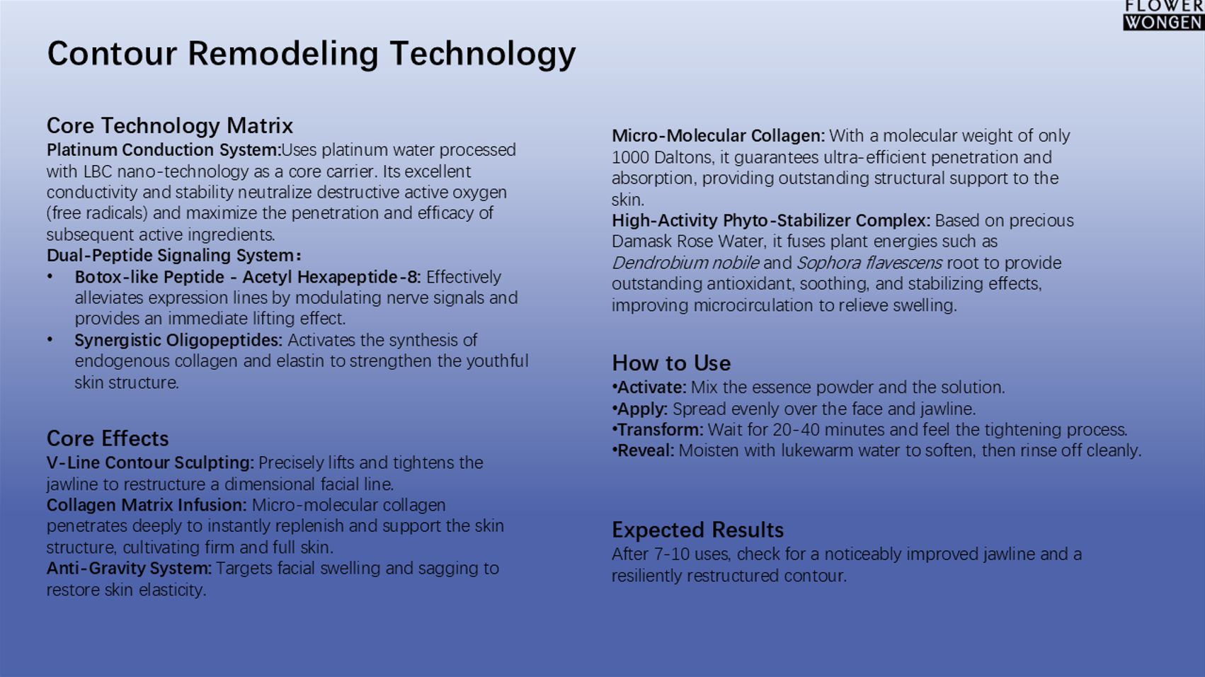 A high-performance contour remodeling essence mask powered by Platinum Conduction Technology and Dual-Peptide Signaling System. It precisely lifts and redefines facial contours while smoothing expression lines. The platinum nano-carrier maximizes absorption, while Acetyl Hexapeptide-8 and synergistic oligopeptides stimulate collagen and elastin synthesis for firmer, more resilient skin. Enriched with micro-molecular collagen and botanical phyto-stabilizers, it nourishes deeply, reduces puffiness, and restores the skin’s youthful V-line definition.